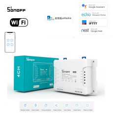 Sonoff 4CHR3 - 4 Kanálový WiFI Spínač - Napájanie je riešené priamo z 230 V a výstupom (tiež 230 V) je možné ovládať spotrebiče až do záťaže 10 A. Smart Sonoff 4CH sú 4 spínače v jednom a umožňujú ľahkú montáž na DIN lištu priamo do elektrického rozvádzača. Spolupracuje s inteligentným asistentom Alexa a Google Home, jednoducho aktivujte zariadenia pomocou hlasu.