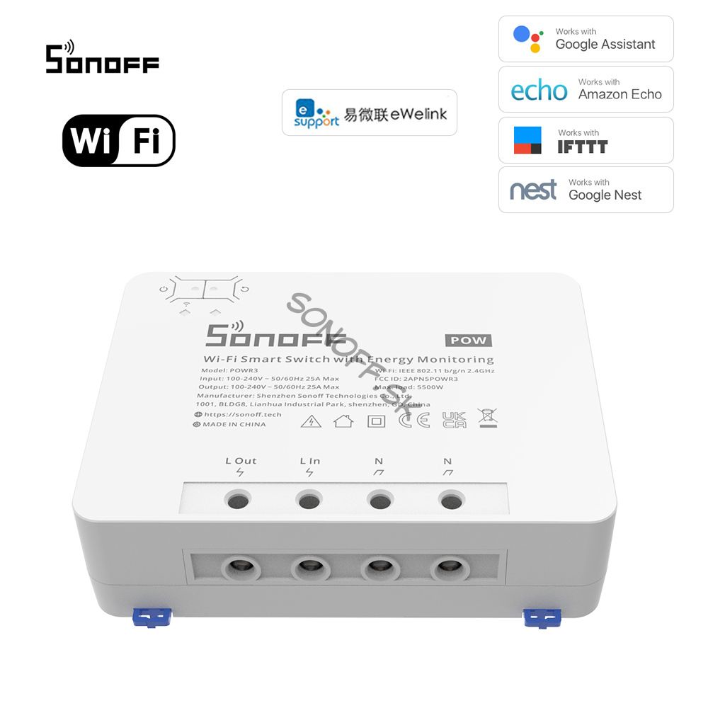 Ovládanie na diaľku nech ste kdekoľvek pomocou eWeLink, Maximálna záťaž až 25A (5500W) Kompatibilný s Amazon Alexa, Google Assistant, SmartThings, Ochrana proti preťaženiu Meranie spotreby energie, Certifikácia CE, FCC.