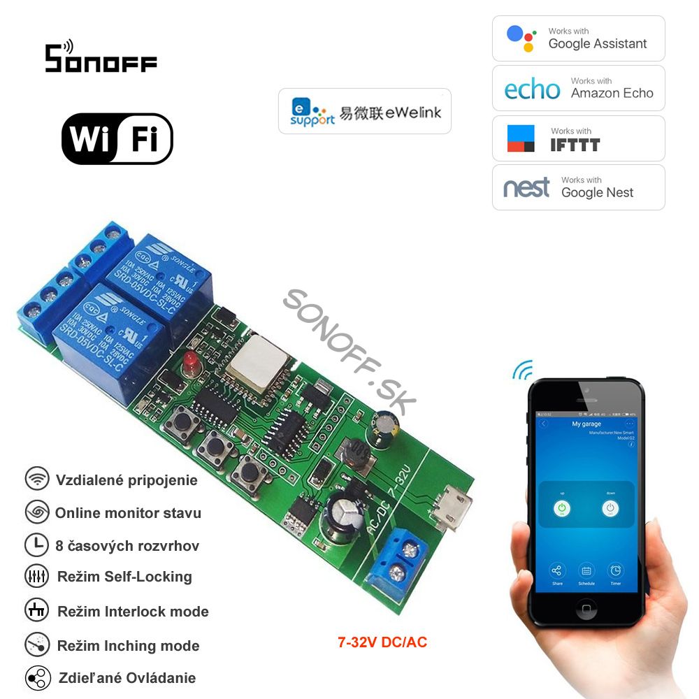 2 kanálový inteligentný WiFi switch - DC/AC 7-32V - tento prepínač WiFi ovláda napájanie 7-32V DC/AC v smere hodinových ručičiek / proti smeru hodinových ručičiek, prostredníctvom aplikácie APP eWeLink. Spínač používa 2-kanálový wifi modul PSA na realizáciu ovládania motora v smere alebo proti smere hodinových ručičiek. Aktuálny stav je synchronizovaný s telefónom používateľa. Vstupné napätie: DC/AC7-32V.