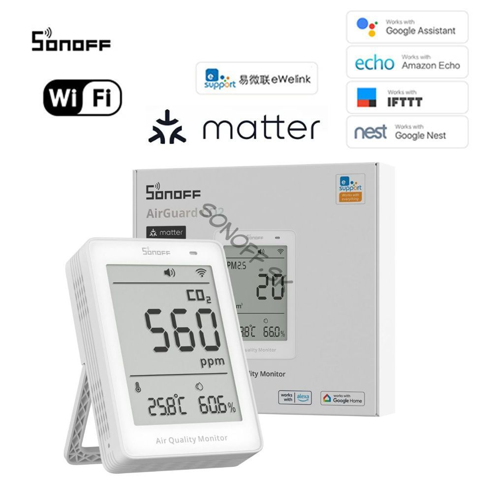 SONOFF AirGuard CO₂ (SAWF-08P) je monitor kvality ovzdušia s podporou Matter over Wi-Fi a technológiou snímania CO₂ založenou na NDIR, ktorý dokáže merať a zobrazovať hladiny oxidu uhličitého, teplotu a vlhkosť v reálnom čase.