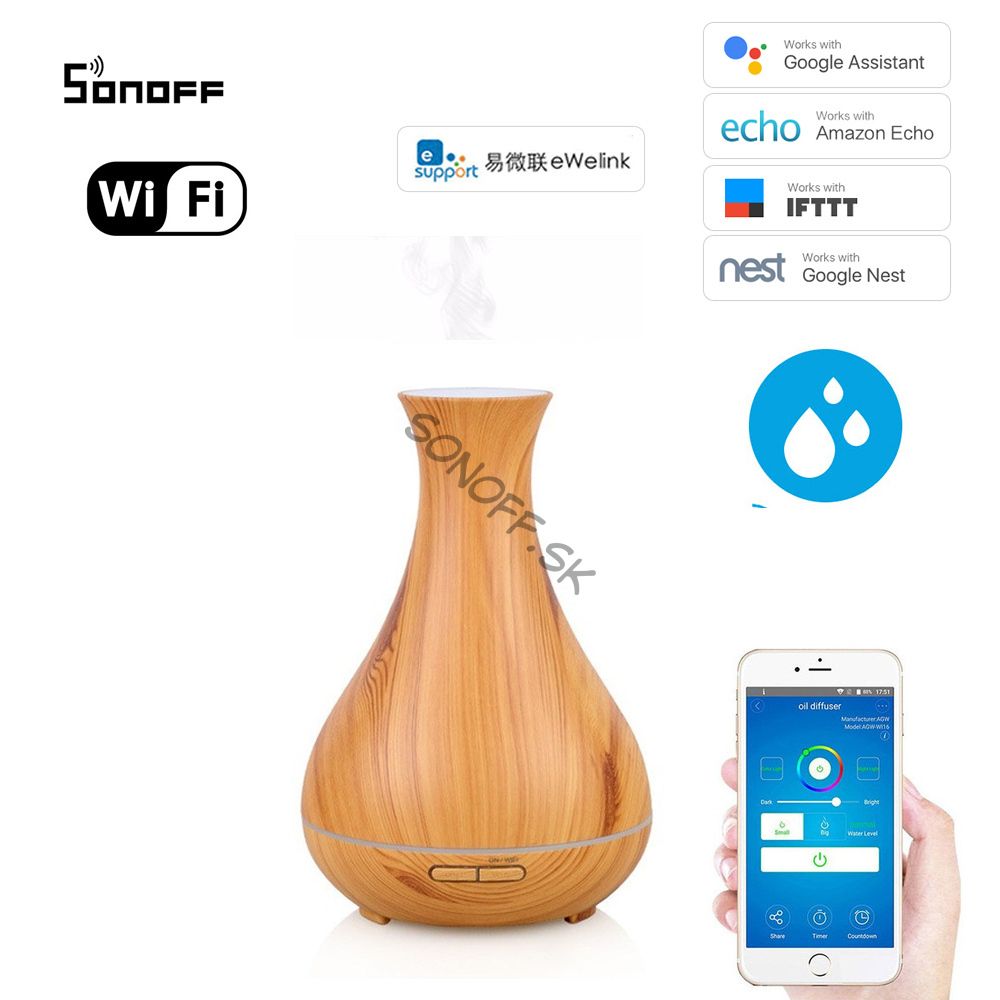 Wifi inteligentný ultrazvukový aróma difuzér svetlé drevo – pomocou ultrazvuku vytvára jemnú paru, LED osvetlenie so siedmimi farbami, štyri stupne časovača, objem: 400ml, svetlé drevo. Ovládanie je možné priamo spínačom, alebo pomocou aplikácie v mobilnom telefóne (iOS aj Android), dalšou možnostou je ovládanie hlasom za pomoci Google Home, Google Assistant, Amazon Alexa, IFTTT a podobných služieb, alebo napríklad inými spínačmi z produktovej rady Sonoff (za pomoci nastavenia Chytrých scén).